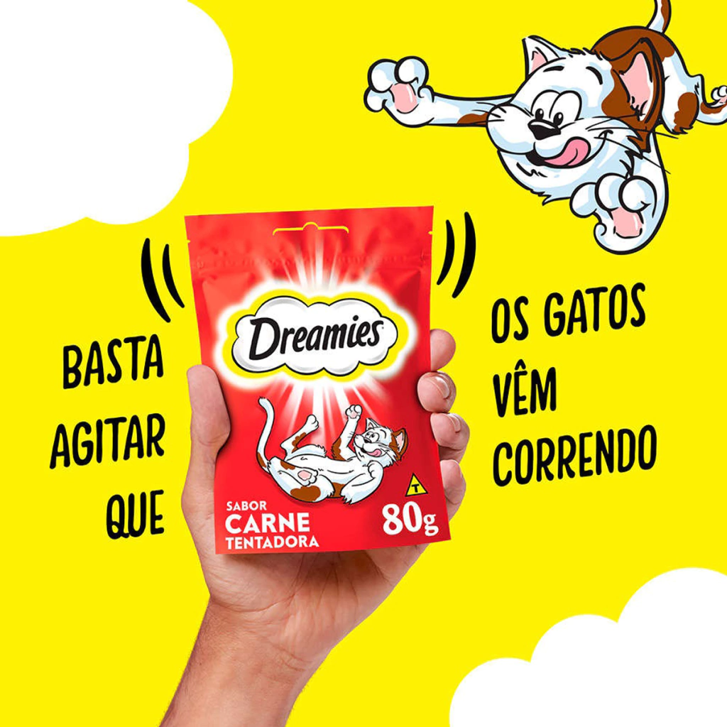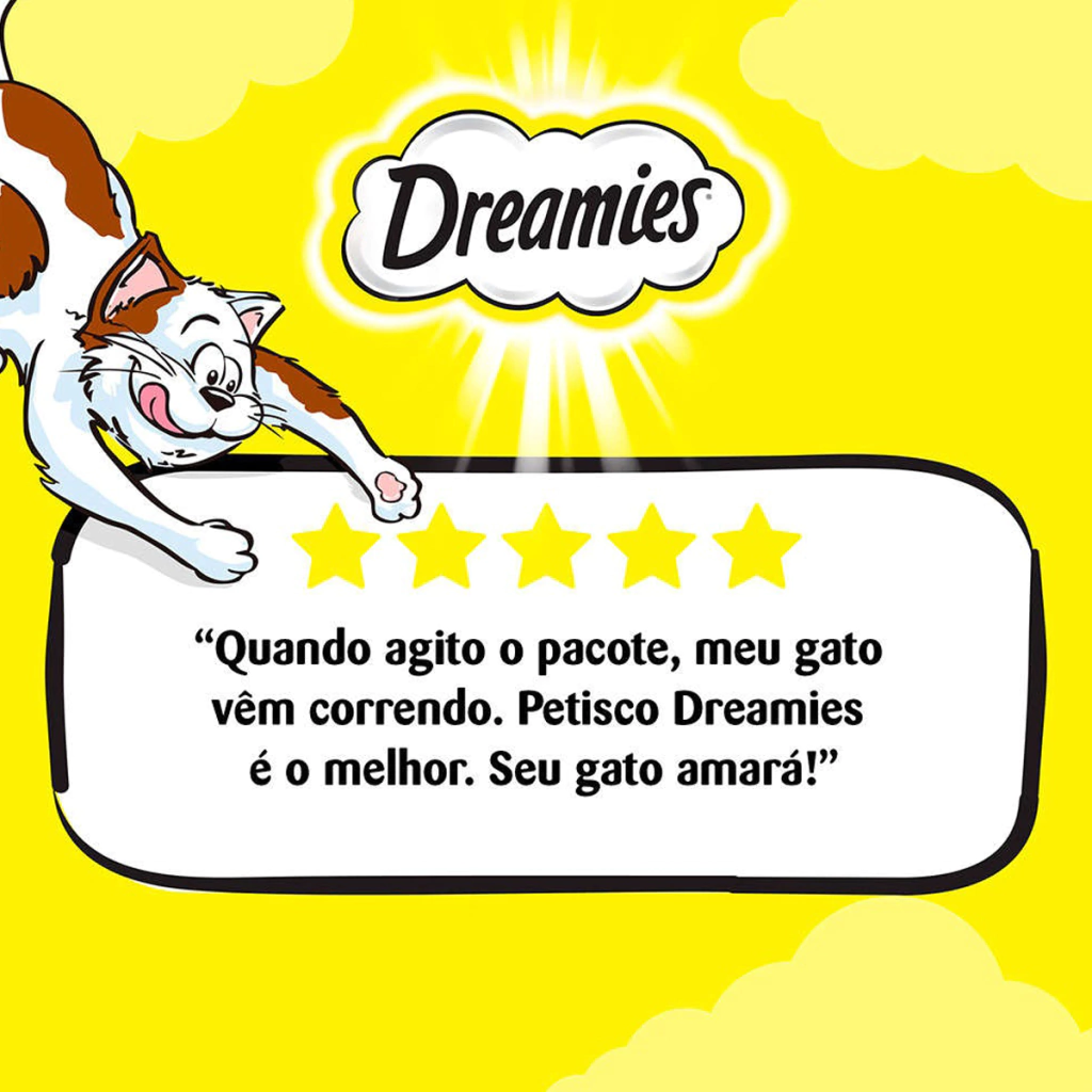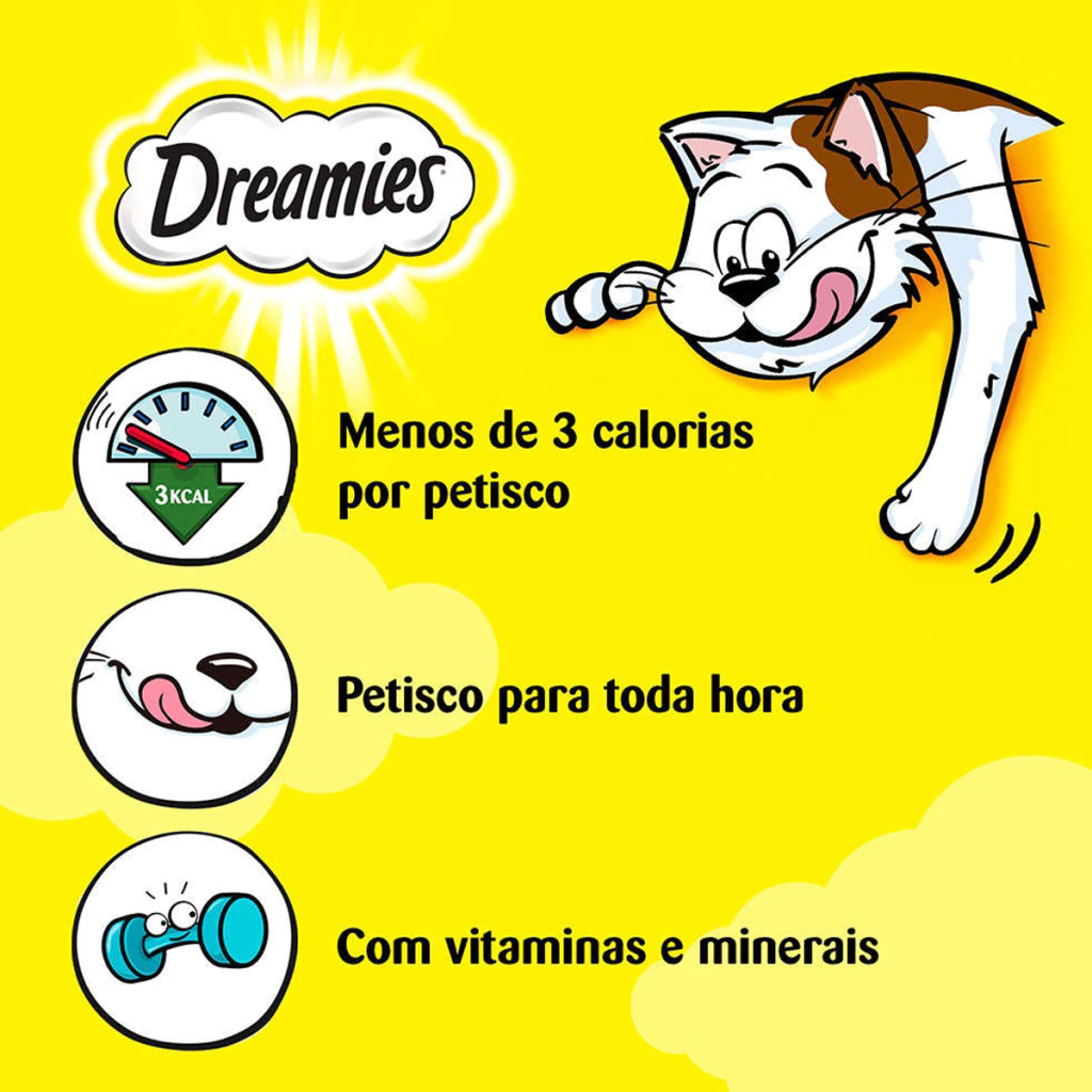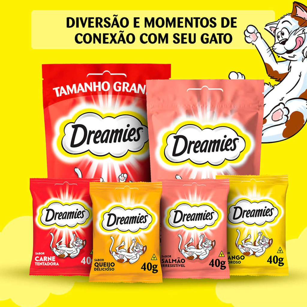 Dreamies petiscos é uma forma de agrado que promove a interação prazerosa. Não se deve substituir a refeição pelo petisco e se deve adequar a quantidade oferecida pelo nível de atividade de seu gato.