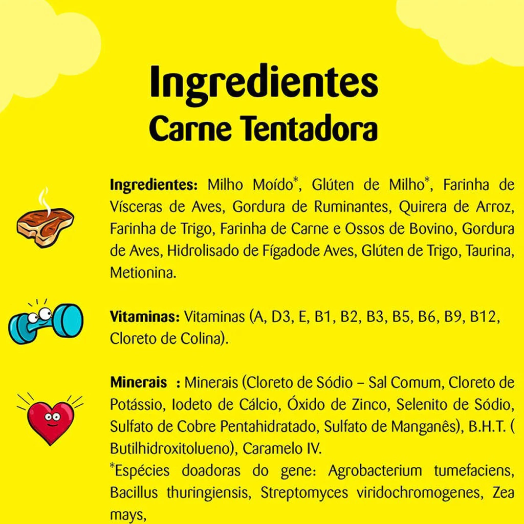 Feito com farinha de subprodutos de frango, glúten de milho, quirera de arroz, milho integral moído, gordura de frango, gordura bovina, glúten de trigo, farinha de trigo, hidrolisado de fígado de frango, taurina, metionina, vitaminas (a, b1, b2, b6, b12, d3, e, k3, ácido fólico, niacina, biotina, cloreto de colina e ácido pantotênico), minerais (cloreto de sódio - sal comum -, cloreto de potássio, iodato de cálcio, óxido de zinco, selenito de sódio, sulfato de cobre, sulfato de manganês), bht, corantes (caramelo e dióxido de titânio). eventuais substitutivos: fosfato bicálcico, farinha de carne e ossos.