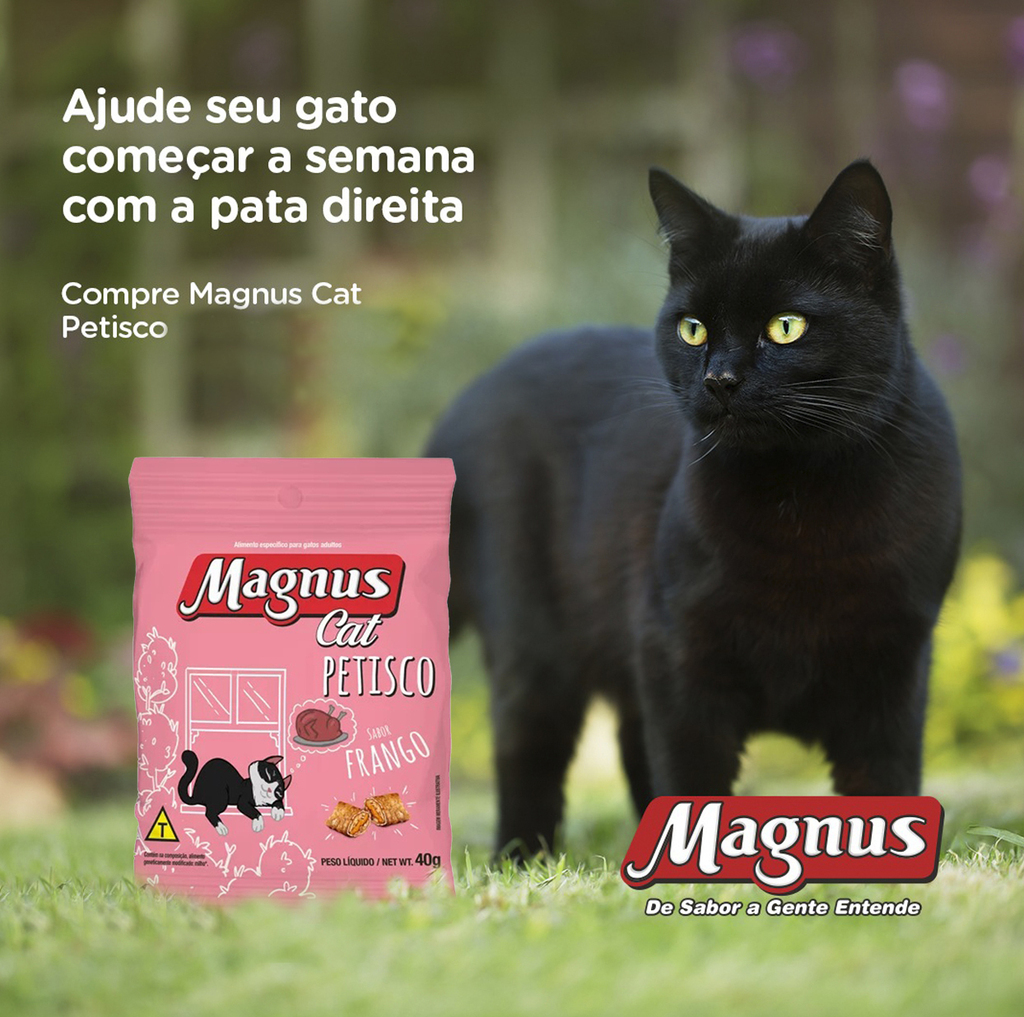 Magnus Cat é uma forma de agrado que promove a interação prazerosa. Não se deve substituir a refeição pelo petisco e se deve adequar a quantidade oferecida pelo nível de atividade de seu gato.