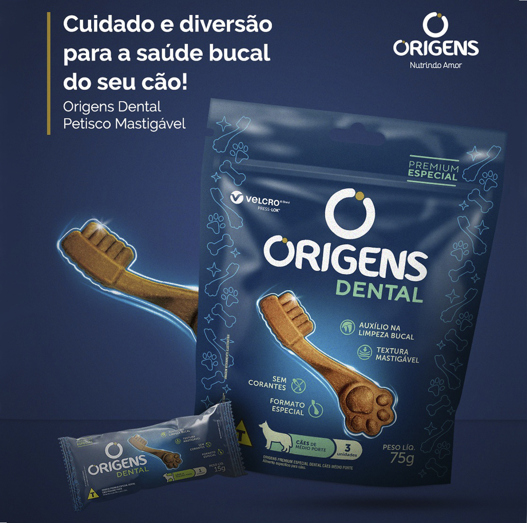 Origens Dental é uma linha de petiscos para cães que colabora para limpeza bucal e redução da formação do tártaro. Saborosa e saudável, a linha Origens Dental é livre de corantes ou aromas artificiais e conta com versões para diferentes portes. Desenvolvida em formato de escova dental, proporciona momentos de cuidado e diversão aos cães.