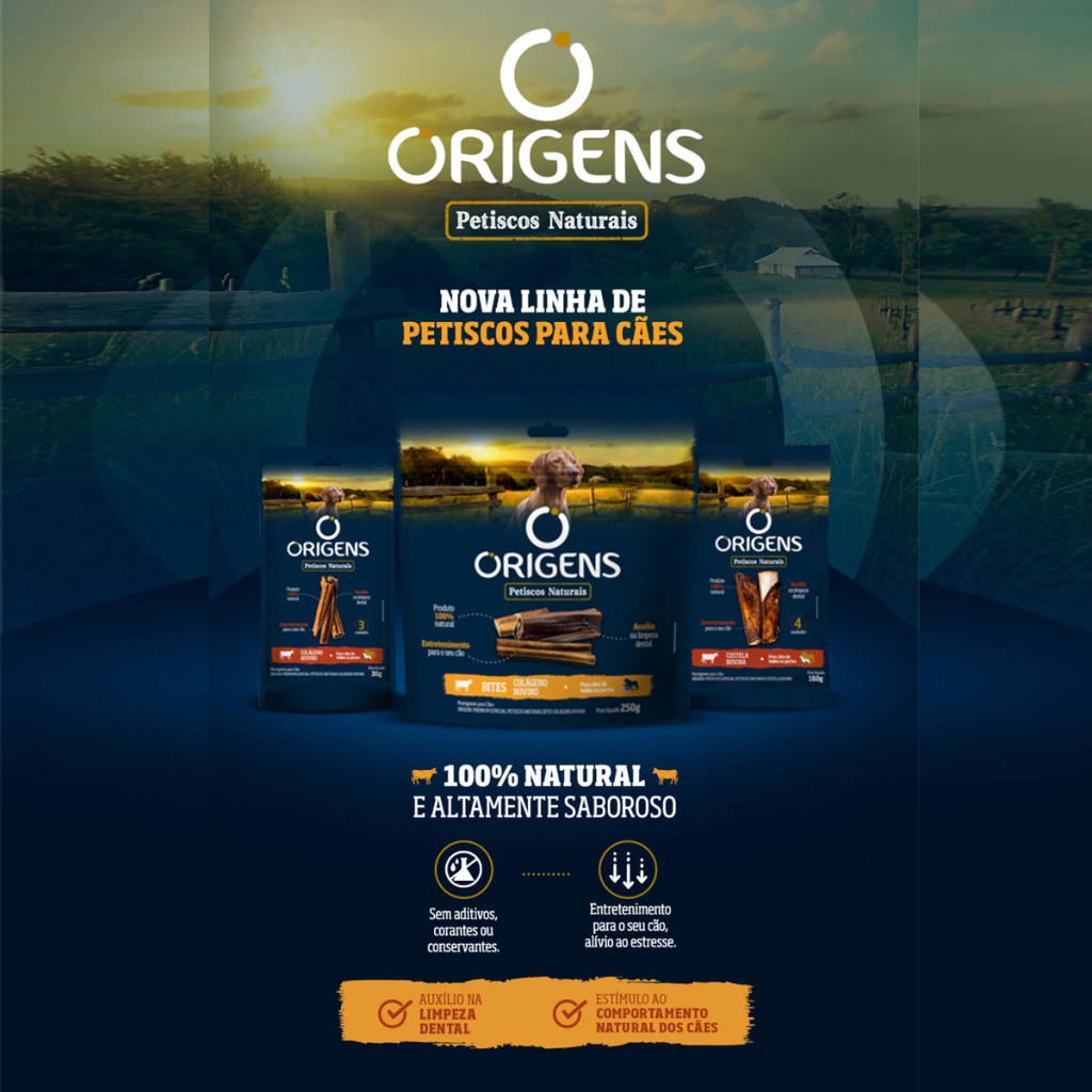 Origens Petiscos Naturais é uma linha de produtos mastigáveis para cães, 100% naturais, livres de aditivos e feitos apenas com 01 ingrediente: coprodutos bovinos desidratados. A linha conta com 10 produtos, que proporcionam enriquecimento ambiental e entretenimento aos cães, além de auxiliarem para a limpeza dental.