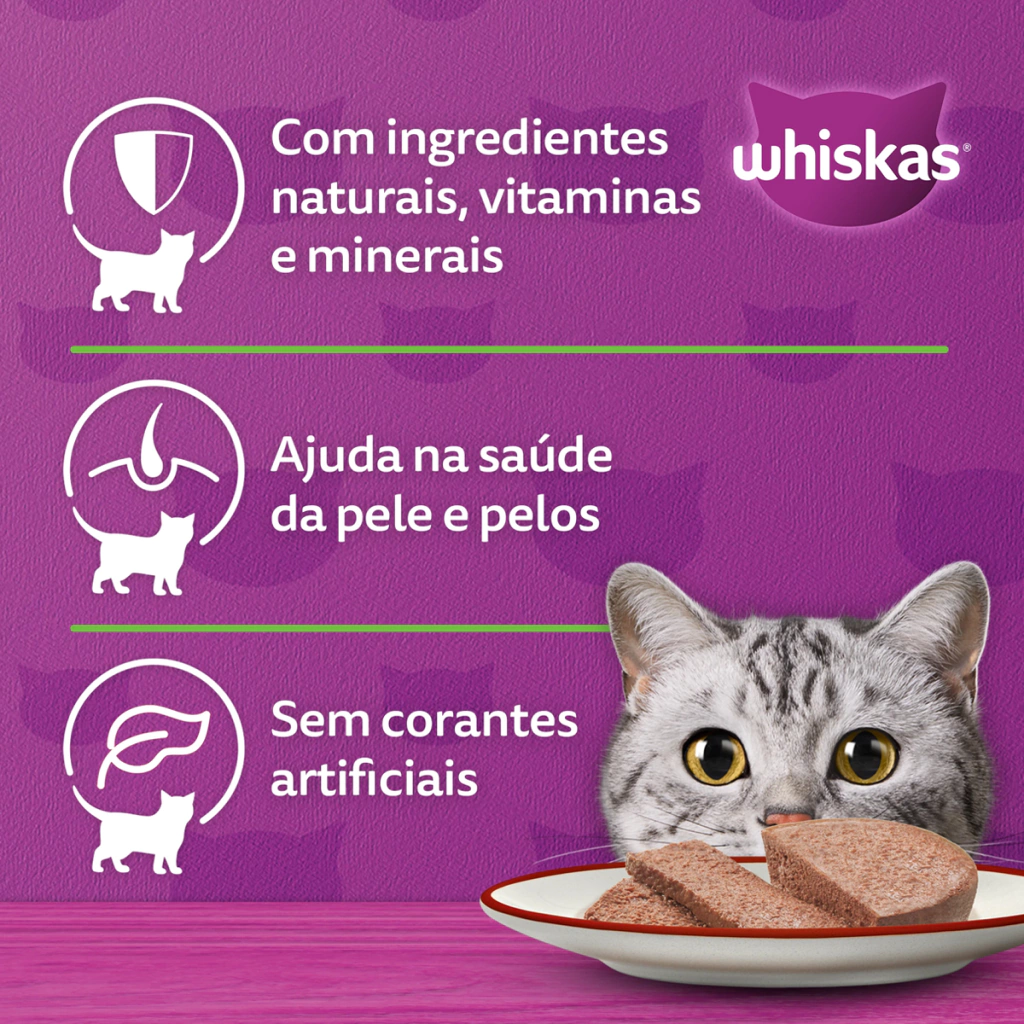Whiskas Patê é indicado para gatos adultos de qualquer idade, Aproveite os momentos de diversão e alegria com o seu melhor amigo. Ofereça para ele um alimento úmido de qualidade. Sem transgênicos e corantes!
